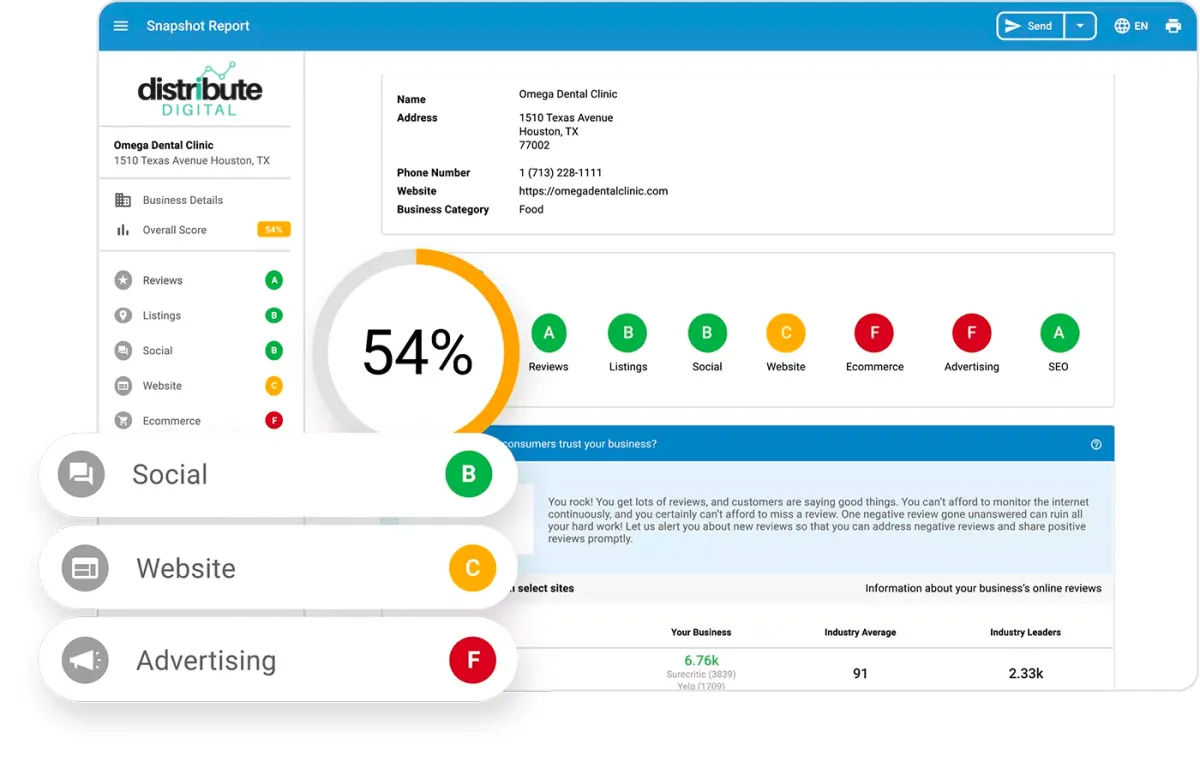 Get a report card of a prospect’s performance across a variety of channels, including social media, website, advertising, and reviews.